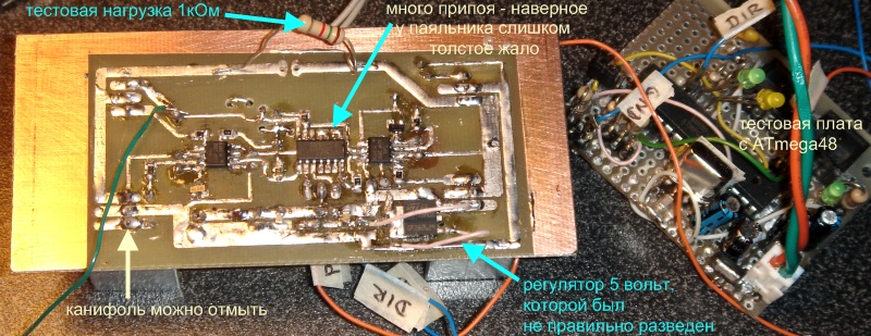 Когда проверил питание - запаял логику и драйвера. Убедился, что ШИМ (с платы с ATmega48) управляет элментами нормально (красиво мигали светодиоды, хотя и проверял осциллографом). Затем запаял силовые транзисторы. Включил питание, услышал неприятое посвистывание, почувствовал, что транзисторы греются - без нагрузки. Похоже, что испортился электролит, что идет на точку соединения двух транзисторов. Я поставил туда 10мкФ, 16в, а там все 24 вольта раскачиваются. На другом плече правда работает нормально, а в этом поменял конденсатор (заодно - диод и драйвер) - заработало, но как-то проблемно (судя по сигналу на осциллографе). Буду кондер вольт на 50 искать (магазин закрыт на праздники).
