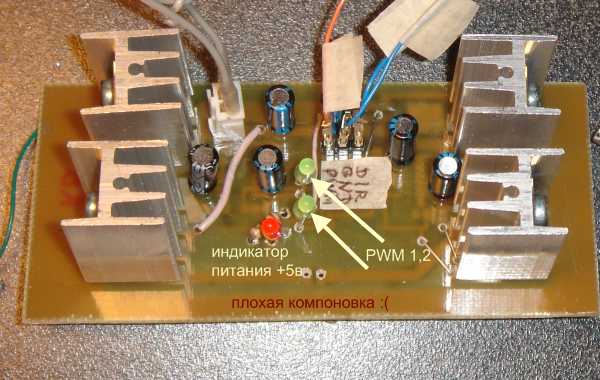 Когда проверил питание - запаял логику и драйвера. Убедился, что ШИМ (с платы с ATmega48) управляет элментами нормально (красиво мигали светодиоды, хотя и проверял осциллографом). Затем запаял силовые транзисторы. Включил питание, услышал неприятое посвистывание, почувствовал, что транзисторы греются - без нагрузки. Похоже, что испортился электролит, что идет на точку соединения двух транзисторов. Я поставил туда 10мкФ, 16в, а там все 24 вольта раскачиваются. На другом плече правда работает нормально, а в этом поменял конденсатор (заодно - диод и драйвер) - заработало, но как-то проблемно (судя по сигналу на осциллографе). Буду кондер вольт на 50 искать (магазин закрыт на праздники).