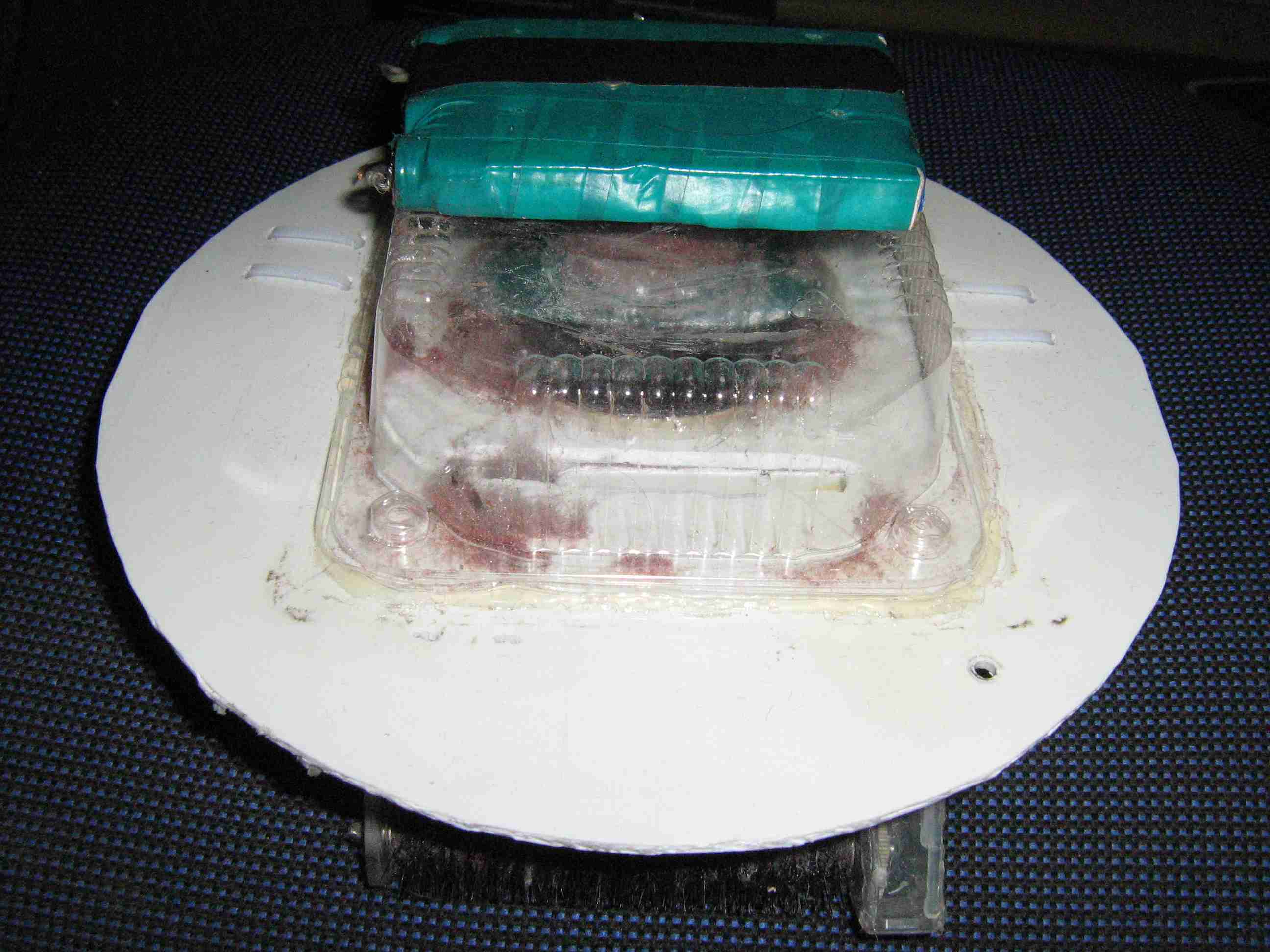 Для печати взял заднюю обложку журнала "Популярная механика" (что ей напрасно под рекламой пропадать). В Eagle установил Mirror\Black\Solid - других настроек принтера не менял. Принтер - самый дешевый Xerox. На обернутый этой распечаткой текстолит положил несколько бумажных салфеток и почти на 3-ке утюгом (с немного неровной поверхностью) минуты 3 с сильным нажимом гладил. Потом положил на пару минут в воду (чтобы промокла) и периодически скатывал пальцами намокшую бумагу слой за слоем. Последние остатки без нажима счистил зубной щеткой (валялась от "вибро-таракана"). Острым ножем сцарапал тонер, где он растекся между контактными площадками или дорожками. Травил в хлорном железе минут 25 - пока не стравилась вся медь. Промыл, ошкурил (металической сеткой для оттирания посуды - не нашел ночью шкурку), с помощью ватной палочки покрыл дорожки жидкой канифолью СКФ, залудил и проверил дорожки на замыкания.