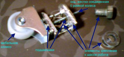 Сегодня переделал поддерживающее колесо на купленное накануне мебельное, с держателем на модельных подшипниках. Колесо показало себя очень хорошо. Небольшое смещение вертикальной оси позволяет роботу поворачивать без сдвига в сторону, а подшипники обещали облегчить задачу.