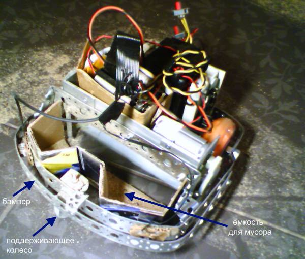 Что еще не нравится: - колеса и шестерни открыты - пыль и мусор могут их заклинить. - схема из двух ведущих колес сзади и одного поддерживающего спереди имеет недостатки по сравнению с парой ведущих по бокам в круглом роботе: труднее поворачивать в ограниченном пространстве; значительная нагрузка на поддерживающее колесо. - впереди необходимы радиальные щетки. - нет датчиков сзади - робот при наезде на препятствие откатывается немного назад и может упереться в другое препятствие, не зная об этом. - пробуксовка не фиксируется - необходимо, например, анализировать вращается ли поддерживающее колесо. емкость для мусора должна быть легко вынимаемая и открытая только перед щеткой.