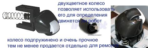 Вот как выглядит подобное колесо на роботе Rumba от iRobot. Узел вероятно довольно нагруженный, по этому он среди популярных у продавцов запчастями. Половинчатая раскраска позволяет использовать его в качестве энкодера - для определения "движется ли робот" (это мое предположение).