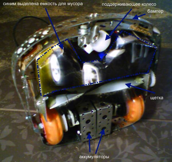 Что еще не нравится: - колеса и шестерни открыты - пыль и мусор могут их заклинить. - схема из двух ведущих колес сзади и одного поддерживающего спереди имеет недостатки по сравнению с парой ведущих по бокам в круглом роботе: труднее поворачивать в ограниченном пространстве; значительная нагрузка на поддерживающее колесо. - впереди необходимы радиальные щетки. - нет датчиков сзади - робот при наезде на препятствие откатывается немного назад и может упереться в другое препятствие, не зная об этом. - пробуксовка не фиксируется - необходимо, например, анализировать вращается ли поддерживающее колесо. емкость для мусора должна быть легко вынимаемая и открытая только перед щеткой.
