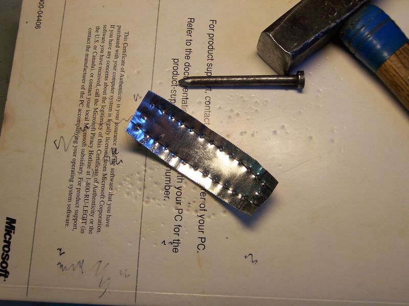 Следующий этап - "проклепка". При помощи специально затупленного дюбеля с обратной стороны пластины наносятся ряды "клепок".