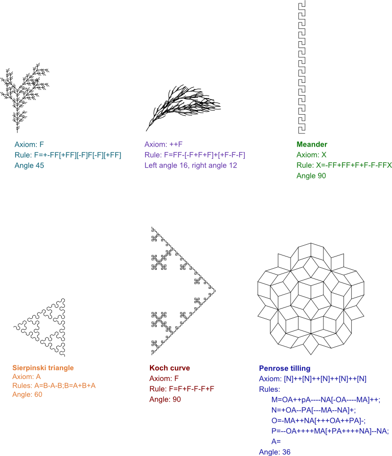 - Много чисто "математических" способов рисования, реализованых с помощью скриптов на python'е. Например, отрисовка систем Линденмайера (см. рисунок).
