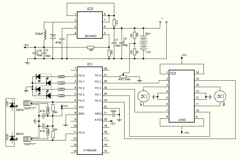 Бот будет обычным ,2 привода на L293D с 2мя ик датчиками препятствий + приемник ик сигнала 40кГц,микроконтроллер Atmega8 думаю справится.