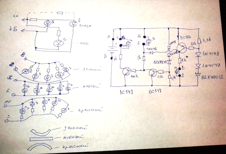 Radist писал(а):Кстати, сегодня в голову пришла такая мысль: добавить пылесосу эмоций. Идея такая: на верхней части корпуса располагается платка с несколькими светодиодами и тсопом. Но не просто так, а хитрым образом. Два двухцветных (для простоты трехногих) светодиода - глаза. Тсоп - нос. И 5 плоских светодиодов в виде лежащей на боку буквы I - рот. Рот отвечает за напряжение аккумулятора (улыбается - заряду еще много, спокоен - половина, скорбит - пора заряжаться). Нос принимает команды с пульта. Глаза сигнализируют о режиме работы (для двухцветных светодиодов таких режимов будет 9). Для управления этим хозяйством надо всего 9 контактов (средняя палочка рта горит всегда, боковушки запараллелены). Ранее предлагали использовать семисегментный индикатор для рта, но сейчас не найти сегменты без наклона.