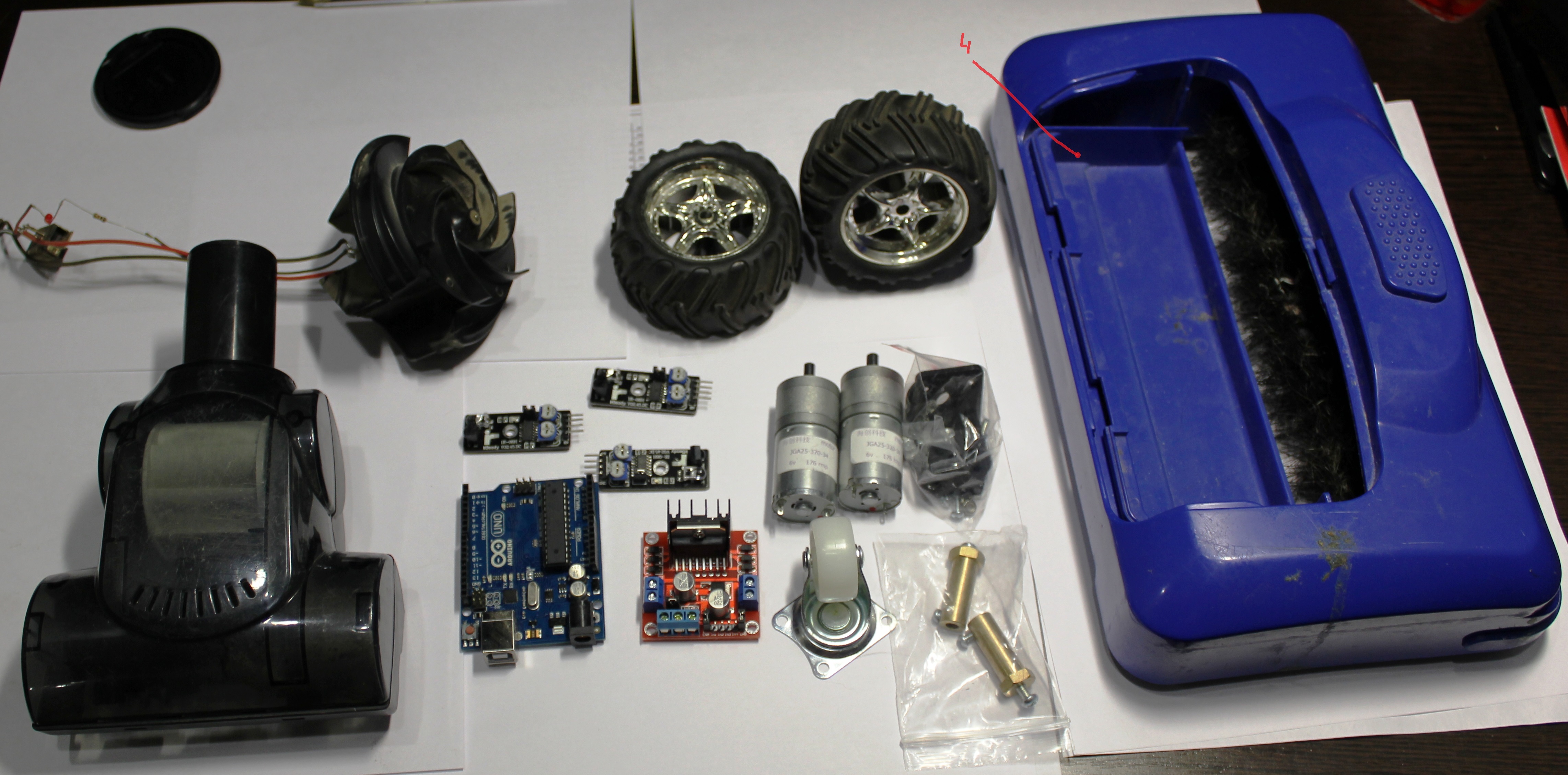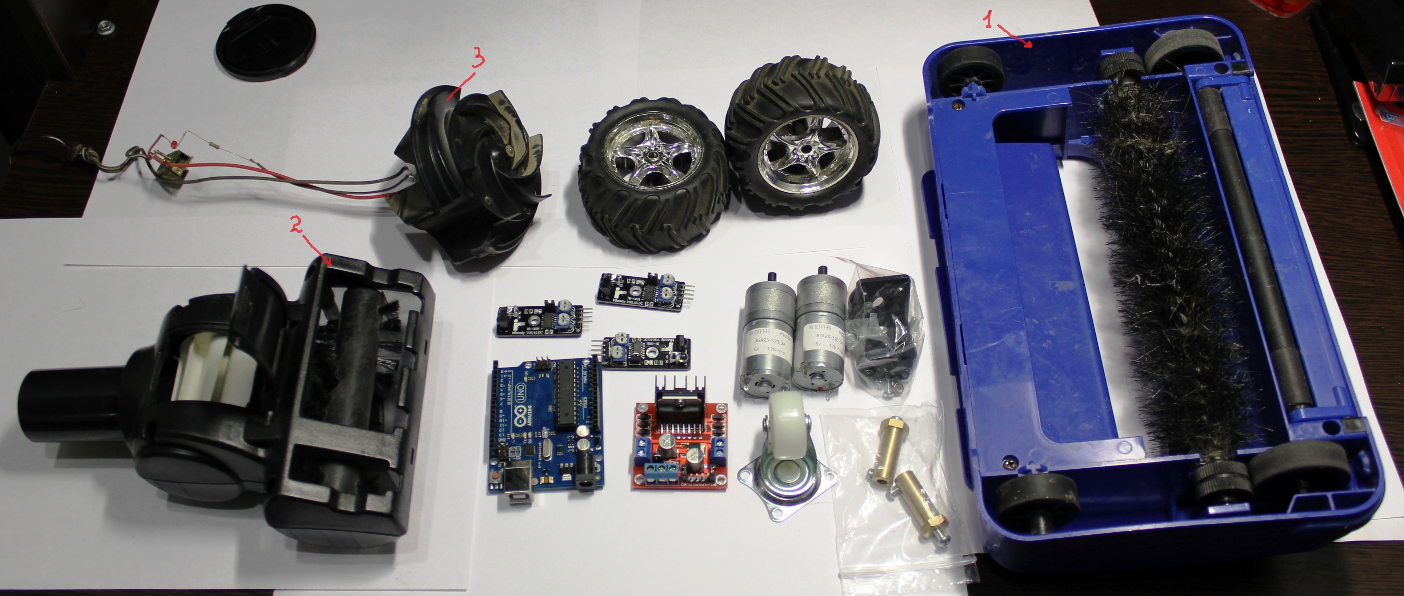По нумерации на фото:1 - Внутренность пылесоса, хочу целиком вставить в пылесос, далее покажу схематично. Колеса которые по бокам щетку, уберу из неё.
