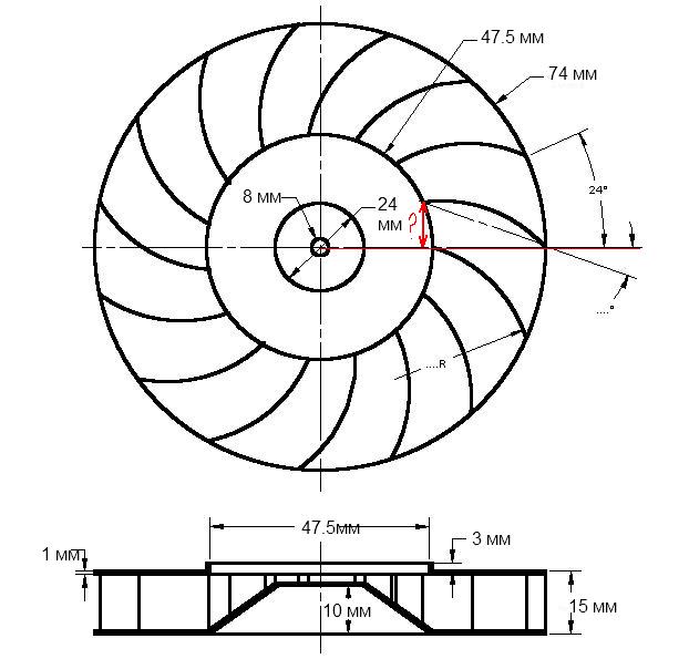 Нам бы с Radist-oм поточнее этот угол (или расстояние внутреннего конца лопатки до линии диаметра, см. рисунок). На фото дык ваще там чуть ли не 30град!
