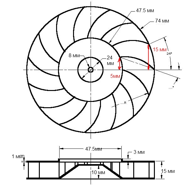 Насчет чертежа турбины - тоже попробую начертить по имеющимся данным. Где-то на форуме я читал, что малое число сильно закрученных лопаток - создают большую тягу, что для пылесоса предпочтительнее. А большое число коротких лопаток - оптимально для прокачки воздуха по длинным воздуховодам. Не знаю насколько это правда.