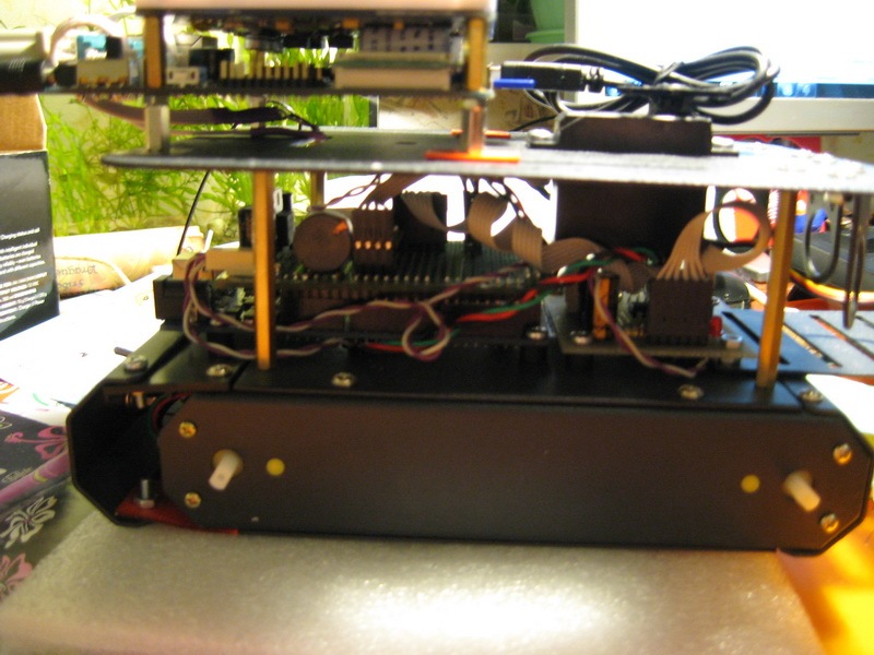 На платформу установил Arduino, блок питания и контроллер двигателей. Так же прикрутил две сервы через скобы Tilit&pan, к которым в последвите будет прикручена камера. Сверху разместил миньку и подключил ее к БП,а через конвертер уровней к com порту Arduino. Аккумуляторов пока нет. Закажу когда собиру железо окончательно и пойму сколько у меня есть места на аккумуляторы.
