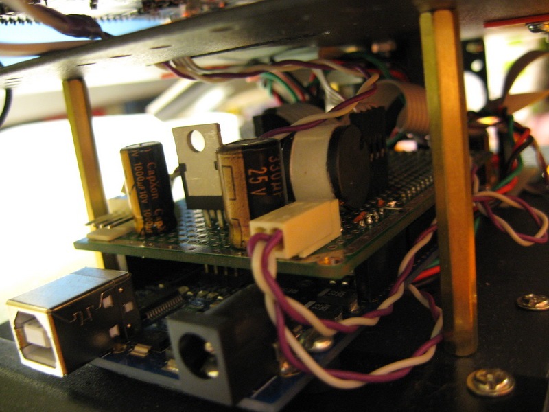 Двойная литий-ионная батарея на 7.2В (для большей емкости) питает плату контроллера двигателей и импульсный блок питания, который формирует 5В 2А для всего остального робота. Плате контроллера двигателей 7,2В необходимо непосредственно для самих двигателей. Блок питания собрал на LM2576.