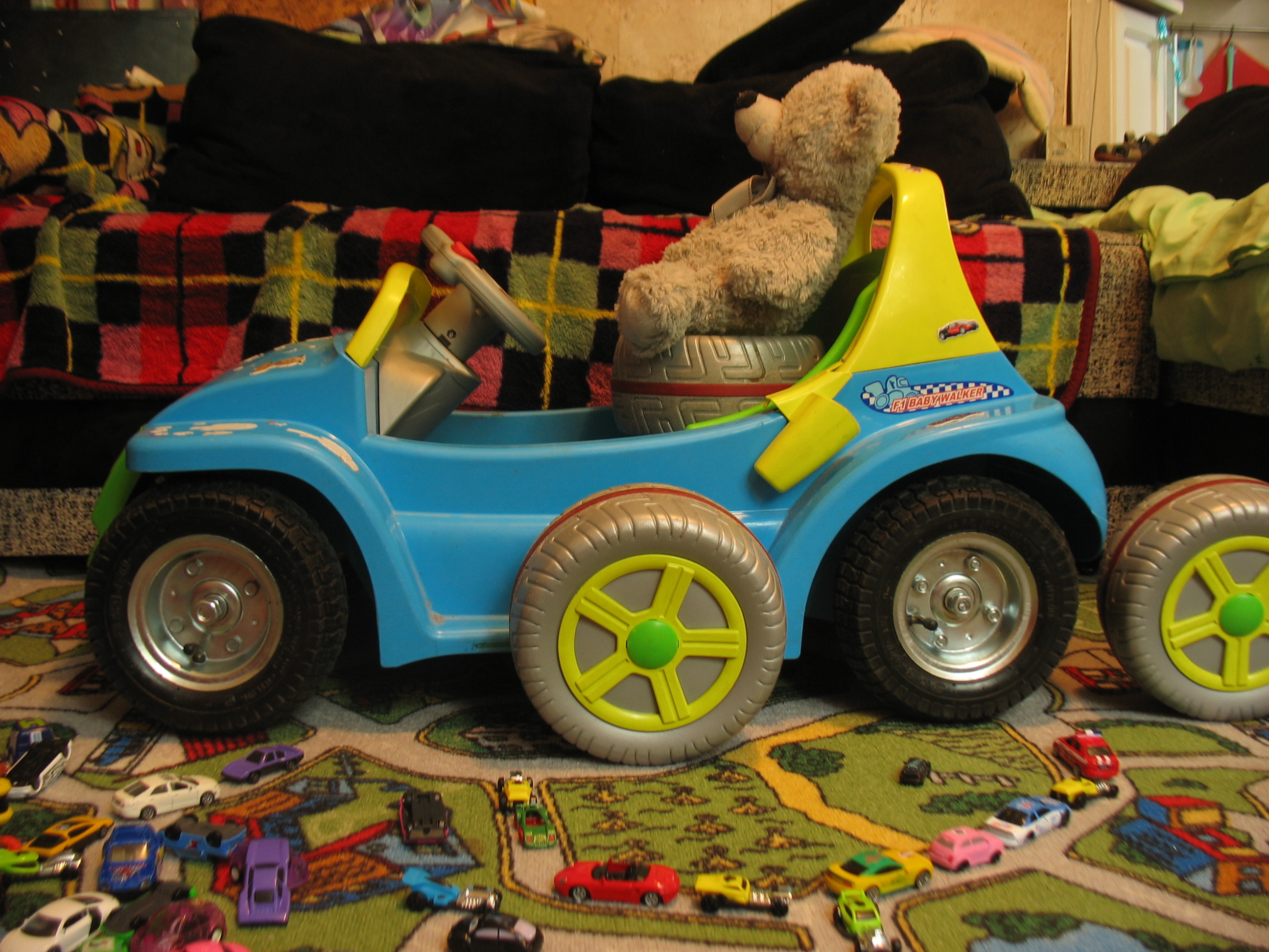 Это стандартная детская машинка Peg-Perego. Выкинул всю штатную электронику и кислотный аккум. Поставил: 2 хоббийных драйвера - ведущие колеса и рулевое управление и полимерный аккум. Управление штатно с руля и джойстик Nintendo Wii Nunchaku. Вощем круто сделал :roll: