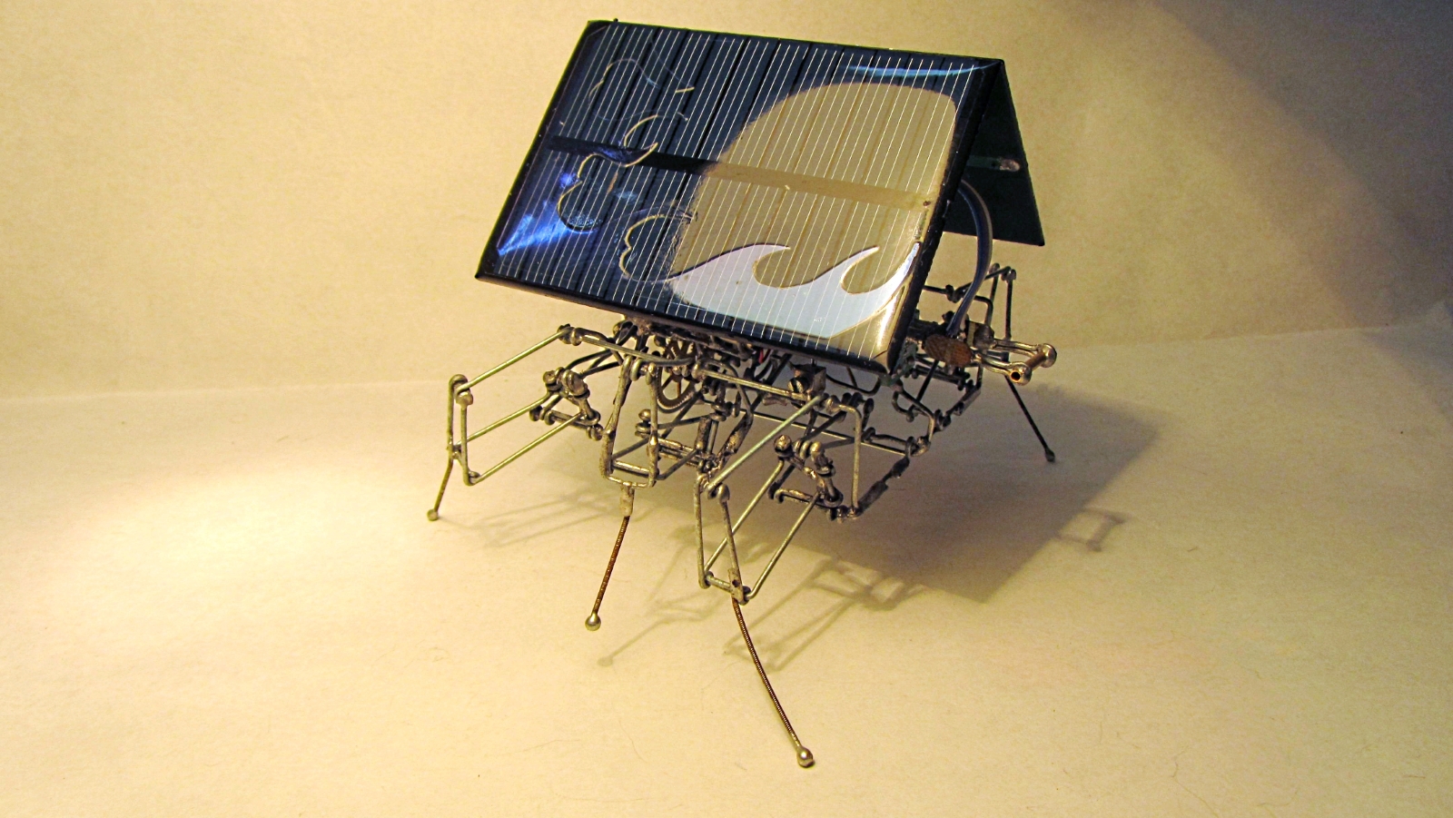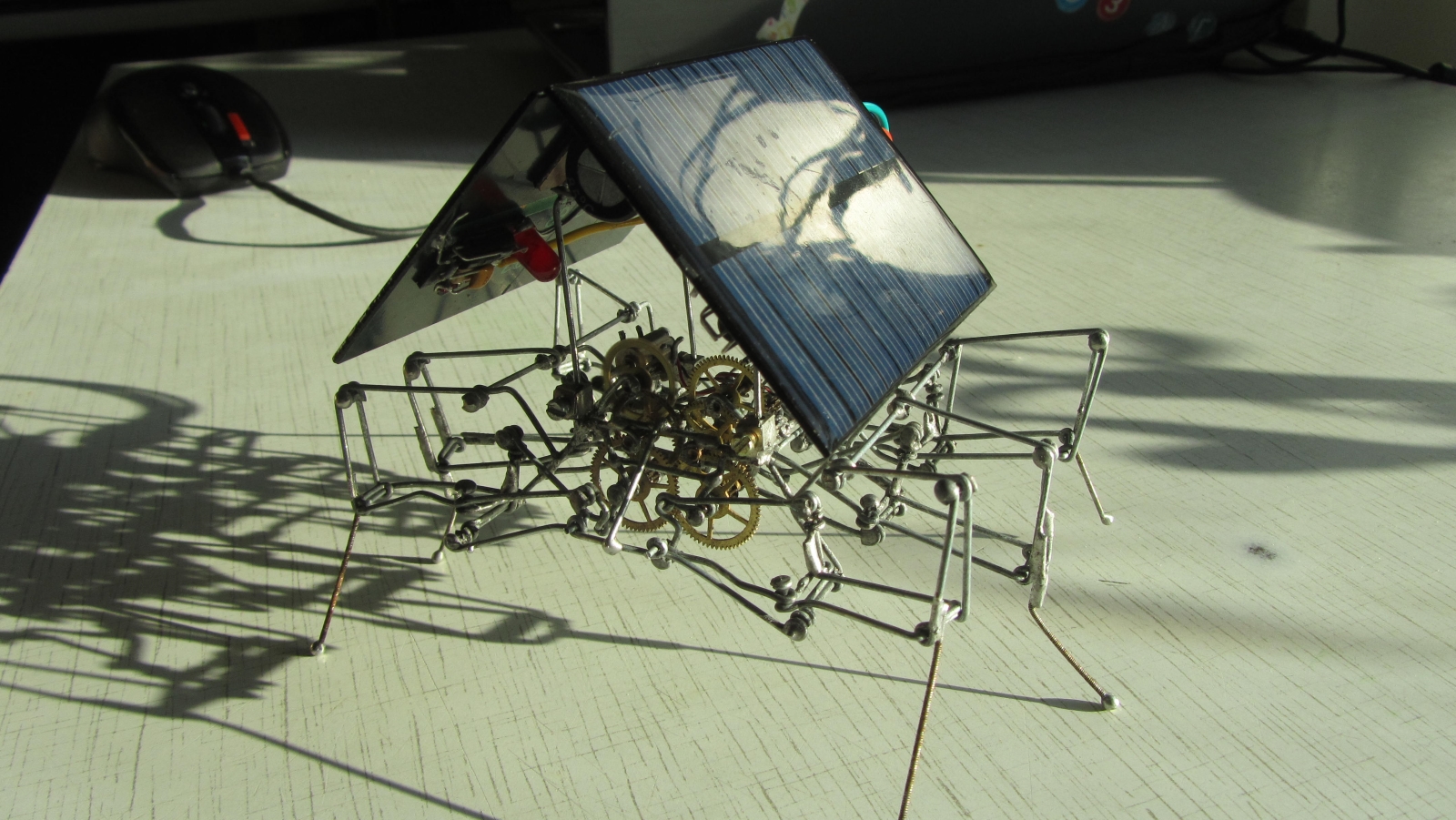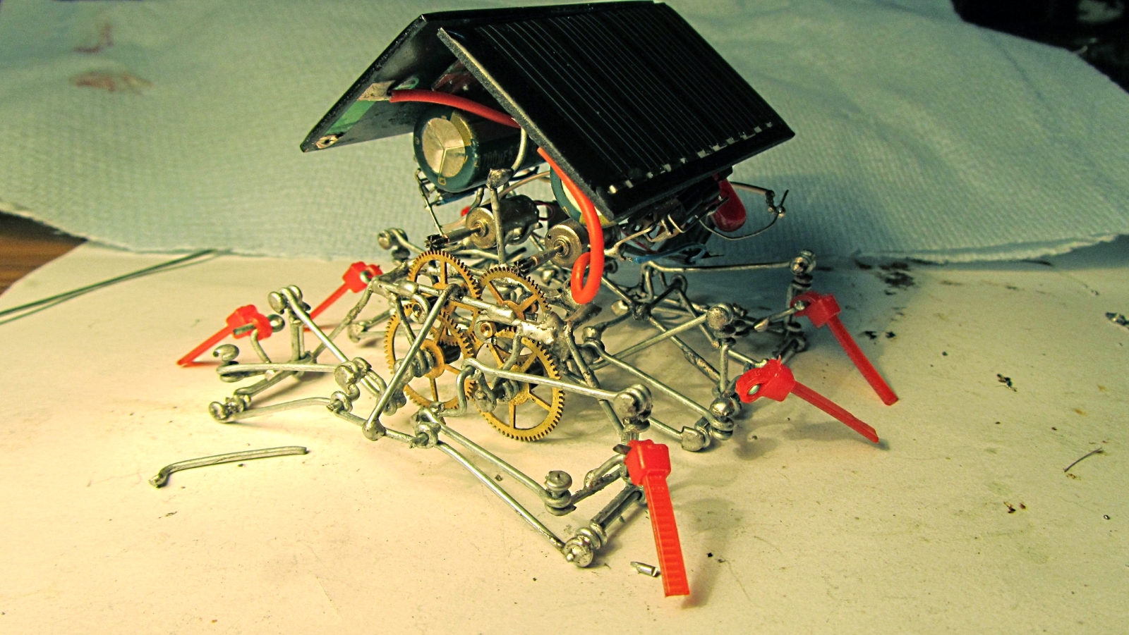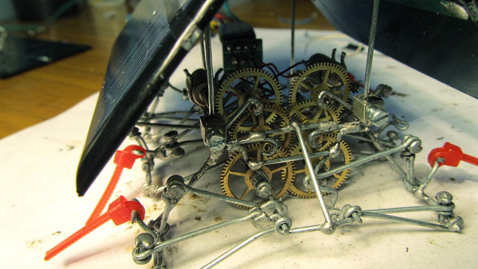 Это хоть и Бим, но проволоки в нём куды больше, чем мозгов. Поэтому большую часть материалов сюды, и пару слов в "Бимы". ___________________ Сия особь представляет из себя разжиревшего Странника. Всё немного раздалось: панельки побольше (6V/0.6W против 5V/0.15W), в ногах по ещё одному коленцу, напруга срабатывания поднята парой диодов с 2.6V до 4V - следовательно, шаги получаются реже, чем без них, но выходят куда мощнее. 93-граммовый огород топает к свету уверенно и непреклонно, сметая и переворачивая прочих бимов на своём пути. Пока думал над названием, получился Бегемот ___________________ Пара фоток и киношка: