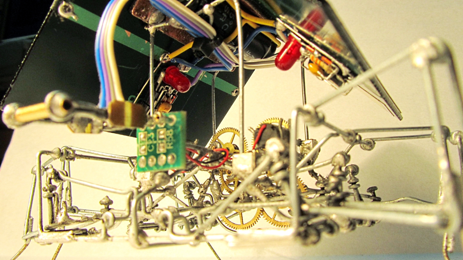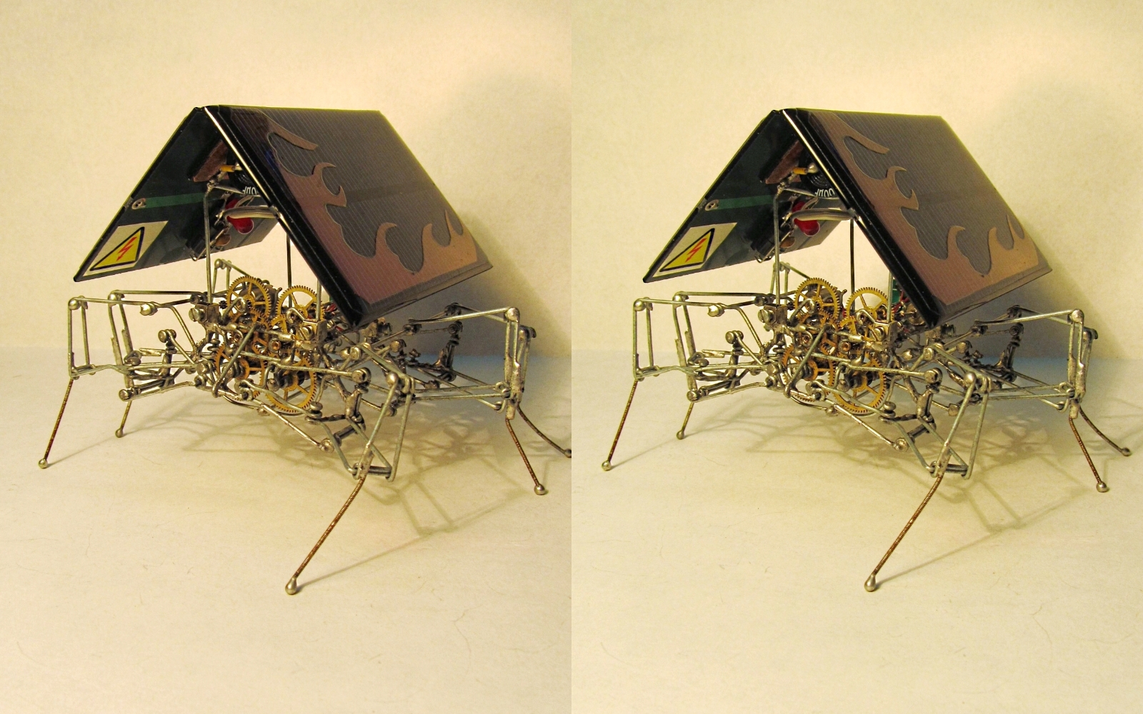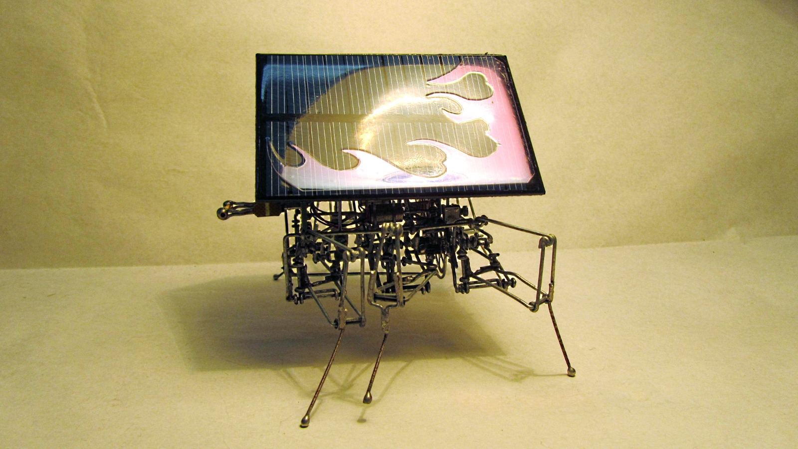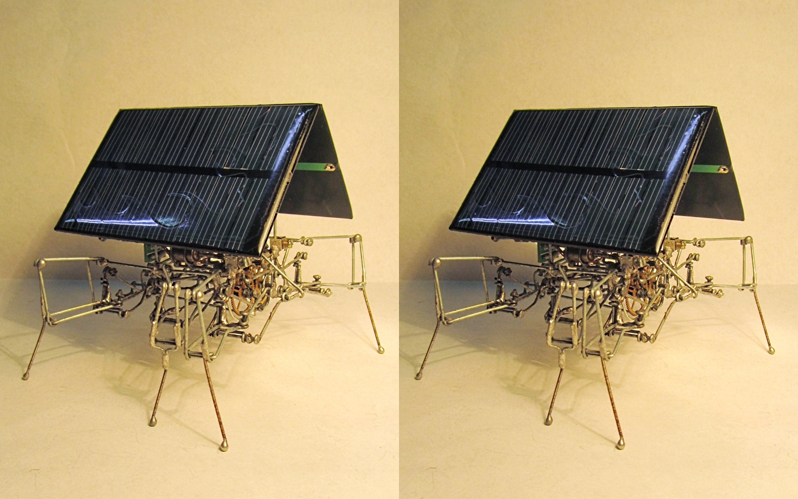 Это хоть и Бим, но проволоки в нём куды больше, чем мозгов. Поэтому большую часть материалов сюды, и пару слов в "Бимы". ___________________ Сия особь представляет из себя разжиревшего Странника. Всё немного раздалось: панельки побольше (6V/0.6W против 5V/0.15W), в ногах по ещё одному коленцу, напруга срабатывания поднята парой диодов с 2.6V до 4V - следовательно, шаги получаются реже, чем без них, но выходят куда мощнее. 93-граммовый огород топает к свету уверенно и непреклонно, сметая и переворачивая прочих бимов на своём пути. Пока думал над названием, получился Бегемот ___________________ Пара фоток и киношка:
