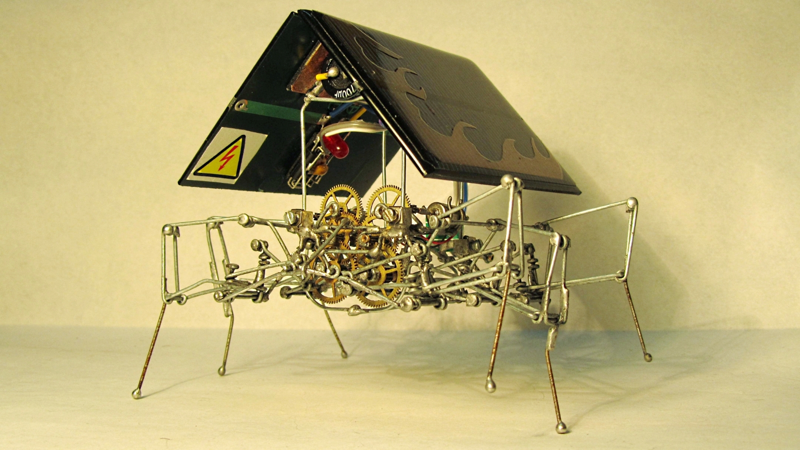 Сия особь представляет из себя разжиревшего Странника. Всё немного раздалось: панельки побольше (6V/0.6W против 5V/0.15W), в ногах по ещё одному коленцу, напруга срабатывания поднята парой диодов с 2.6V до 4V - следовательно, шаги получаются реже, чем без них, но выходят куда мощнее. 93-граммовый огород топает к свету уверенно и непреклонно, сметая и переворачивая прочих бимов на своём пути.