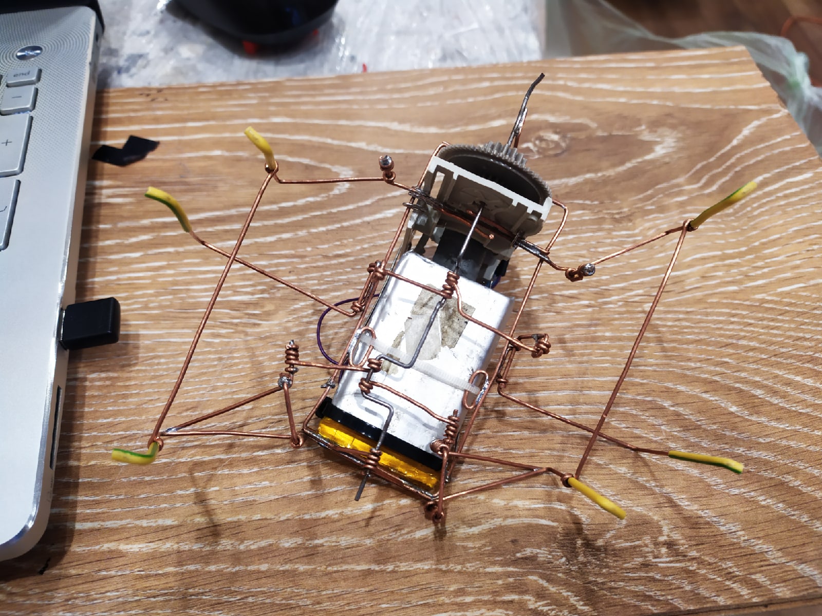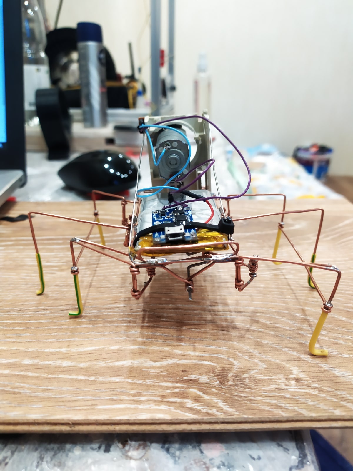 Эх, помню, четыре-пять лет назад увидел эту тему, охренел, перечитал от первой страницы до последней и побежал собирать своего таракашку. Что-то тогда получилось, даже ползло куда-то, но совсем плохо. На всеобщее обозрение выставлять и мысли не было) Скрепки тонкие были, у меня руки еще не особо посажены, клинило все и прогибалось под собственным весом, и в общем остались только какие-то обломки от того творения. А в наши дни уже по памяти(врезалось, однако, с тех времен ещё) сел и за пару вечеров собрал скрепыша, по классической схеме Шалтая. Из медной проволоки спаял, только колено из толстой скрепки, как редуктор взял целый кусок от сидирома, ну, на фотках там все видно. Забавно вышло, бегает, хоть и не прямо, но так даже интереснее Сижу, смотрю как он по полу свое "тыктыктыктык" делает и жмурюсь прям от удовольствия. Огромное человеческое спасибо МегаБизону и всем-всем-всем за деформацию мозгов подрастающего поколения в нужную сторону. Пожалуй, отсюда мое увлечение и началось, с машинок фенольных и павуков из скрепок
