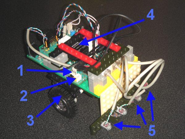 Для конроля за правильностью монтажа (наклейки) датчиков, япроверил их на короткое замыкание и подключил к роботу. Использовал простую программу на BASIC-e, вот фрагмент основной части. Думаю можно использовать и батарейку с тестером.