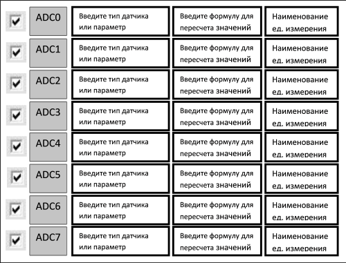 галочки - это авто обновление, т.е. если установлена галочка, то происходит периодическое обновление значений, если галочка не установлена, то для обновления нужно щелкнуть по кнопки "ADC#"