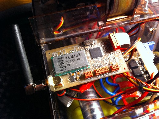 Плата телеметрии. Ксемикс приёмо-передатчик на 900 мГц. Сделано избыточное кодирование и проверка контрольной суммы для обеспечения безопасности от самопроизвольных выстрелов. Полностью цифровой канал. Микроконтроллер pic-18 серия.