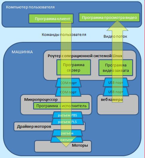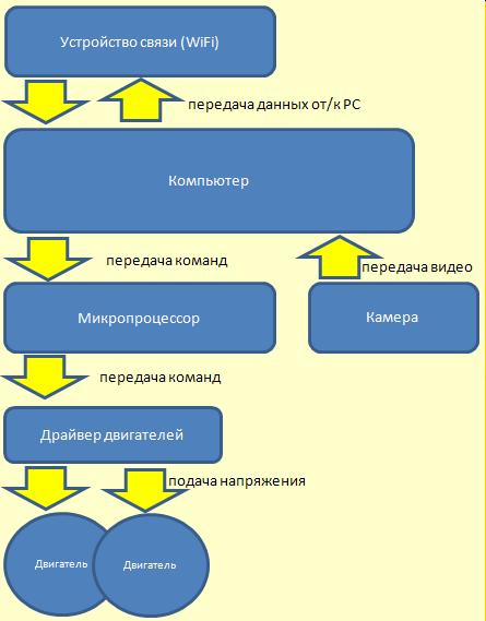 Выбор платформы Стало понятно, что придется делать его самому. К этому времени я пришел к выводу, что есть смысл рассматривать строительство робота только с использованием WiFi в качестве радио, как для видео, так и для команд управления. Идея использования каких-либо радиоразработок для передачи видео и управления из сферы RC мной сразу отметалась, так как сформировалось второе требование к роботу: меньше сложностей и дешевле, кроме того, идея была в управлении через компьютер, а не пульт. Не подходил и Bluetooth, в силу своей маломощности в смысле дальности связи и нагрузки на такую сеть. Если использовать такого робота на открытой площадке, то теоретически дальности WiFi должно быть достаточно для достаточно продолжительной трассы. Погуглил на тему, кто уже что собирал. Информации оказалось настолько мало, что я поразился. Второй удивительный факт – отписывались в основном иностранчеги. Чтоб дальше было понятно, сразу приведу типовую схему встречающихся проектов:
