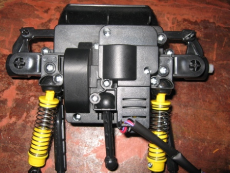 Микросхема то есть, только во-первых, это не реалтек, во-вторых не DIP корпус (пластиковый,большой), и вообще я ее идентифицировать через инет не смог. Где там, «вперед», «назад»- пойди разбери. Я попытался было измерять напряжение на каждом выводе при подаче команды с пульта, но бросил это занятие, не найдя в нем надежной и понятной мне логики, ибо на разных контактах присутствует как + так и – 3,3в. Еще раз оглядев платку я добавил, что все равно не смог бы напаяться на нее – для меня это слишком ювелирно. В общем плату выкидываем, записав на ум, что тебе придется самому сваять нечто подобное. На второй стороне платы мы видим то, что Джо по своей канадской наивности, не тронутой передовыми китайскими решениями, называет «steering circuit» - цепь управления рулевкой и призывает ее беречь, имея в виду, что рулевка выполнена на сервомоторе, который, в отличие мотора колес, имеет обратную связь. Могу сразу сказать, что в данном автомобиле ничего подобного, к сожалению, нет, а поворот колес выполнен чудовищно – на валу передних колес нечто вроде рулевой рейки, на нее, через Г-образную передачу идет момент от простого (не серво) моторчика. Так вот, чтобы повернуть надо подать напряжение на моторчик, а при крайнем угле поворота этот моторчик находится под напряжением и в заблокированном состоянии и естественно потребляет 1,0-1,2 Ампер, что мало того, что сажает батарейки, так и забирает почти всю мощь батареек на себя, лишая энергии моторы колес. Проблема в том, что крайний угол – достигается сразу и всегда, стоит только нажать на кнопки поворота. Автомобильчик полноприводный – имеет 2 моста со своим движком на каждом. Однако после установки всего нового хозяйства (роутер, микропроцессор, камера, доп.батареи) на машинку, стало понятно, что моторчики полное г… Машина не едет, не смотря на наличие двух ходовых моторов… Разобрав переднюю ось: