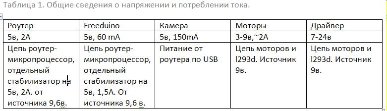 Как говорилось выше, выбор отличного от Джо роутера и отказ от сетевой камеры повлекло за собой внесение ряда изменений. В числе положительных: более низкое энергопотребление и меньше видов напряжения – роутер, камера Freeduino – все потребляет по 5 вольт. Теперь таблица токопотребления: