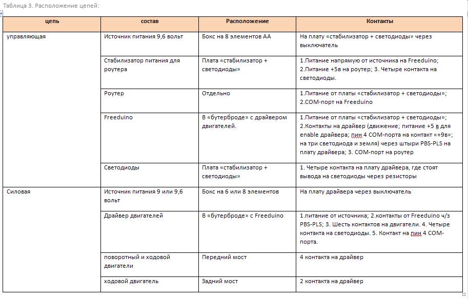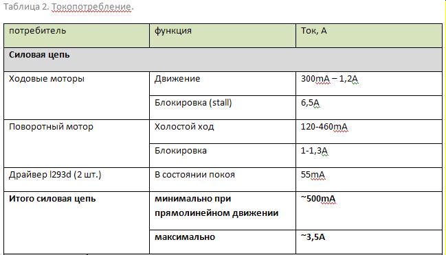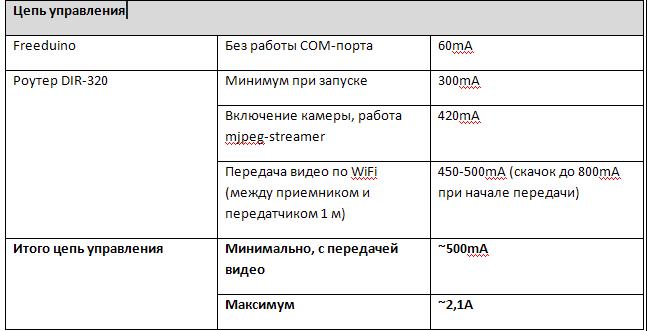 Таблица токопотребления нужна, чтобы: 1) сделать правильный подбор по мощности электронных компонентов (драйвер двигателей и стабилизатор напряжения для роутера); 2) понимать поведение компонентов при разных режимах потребления (таких, как блокировка всех моторов); 3) выполнить оптимальный подбор источников питания, имея в виду продолжительность беспрерывной работы всего хозяйства.