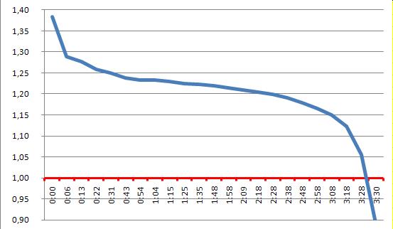 все не влезло, лимит на 15 картинок, поэтому продолжаем, где мы остановились?: Результат – 3 с половиной часа. Похоже, номинальная емкость аккумуляторов не соответствует реальной - соответственно потребляемому току, в 500mA ёмкость аккумуляторов GP2500 составляет около 1900mAч. Это соответствует результатам теста аккумуляторов (ссылка выше), где аккумуляторы GP емкостью 2700mAч показали реальную емкость 2,05 Ач на токе 500mA: