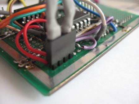 Enablы микросхем решил подключить к Freeduinoвскому +5в. через резистор 10К. Почему резистор – продвинутые товарищи на форумах говорят, что иначе вход микросхемы может подпалиться от чистого +5в. Почему Freeduino – на enable д.б. макс +5 в, в цепи моторов его нет (там +9в) и пришлось бы ставить стабилизатор питания с 9 на 5 вольт, что мне не нравится, ввиду усложнения + стабилизатор даст +5в если к нему идет не менее 7,5в. Enable жрет мизерный ток ~10-20мА и цепь Freeduino это даже не заметит (там минимум 0,3-0,5А с роутером). Все, что идет от микропроцессора (порты вывода)– через PLS на другой стороне платы. Далее, внизу еще одна микросхема и провода – то же самое, но к ходовым моторам. Теперь правая часть платы.