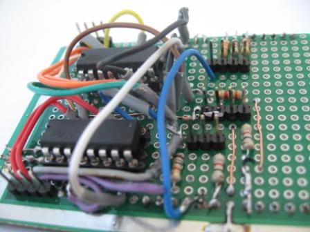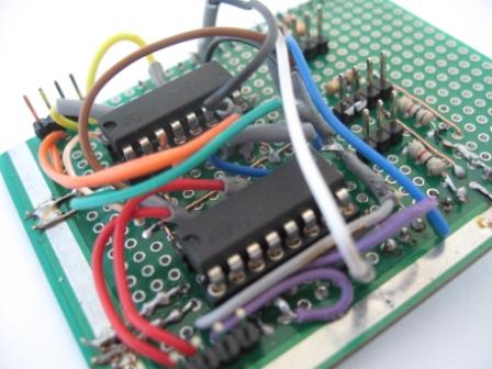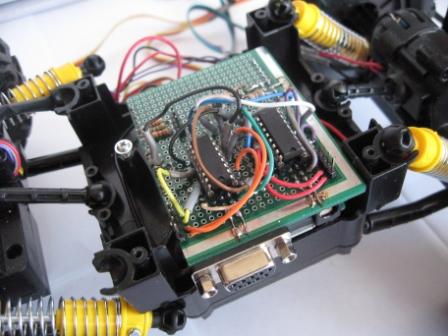 Теперь собственно самое главное - сам драйвер. Во-первых, нужно рассчитать, какая сила тока будет потребляться двигателями.Это нужно для выбора правильной начинки. У моей машинки получалась такая картина, что рулевой движок хавал до 1,2 Ампер, ходовые в движении примерно 500mA. Это по результатам замеров мультиметром, но можно взять данные из даташита, если он есть. Погуглив, обнаруживаем, что большинство драйверов для маломощных моторчиков работает на микросхеме l293d, она очень популярна при строительстве всевозможных маленьких роботов. Одна такая микросхема может управлять двумя моторами мощностью по 600мА или одним – 1,2А. Люди пишут, что насадив одну микруху на другую, можно удвоить ее мощность, если нужно. Про принцип ее работы можно почитать на , неплохо расписано. Здесь я повторю лишь основное – на ней 2 подводки питания – одна для логики микросхемы,одна для движков. Питалово можно объединить. Для каждого двигателя предусмотрены 2 контакта на сам движок и 3 на управление – их одключают к микропроцессору. Из этих трех один (т.н. enable) можно использовать для регулирования скорости мотора, есть такая штука ШИМ, нам не нужна в этом проекте, поэтому распинаться не будем. Два других – регулируют направление вращение, когда на одном +5в, а на другом 0 – вращение в одну сторону, если наоборот – то в другую. Если проще – на процессоре мы определили порт вывода «вперед» и порт «назад». Когда на одном +5в – на другом всегда 0в и наоборот. Они и подключены к упомянутым выводам L293D. Просто? Из неприятного – микросхема кушает около 1,5-2 вольт, откуда бы вы думали? Из питания логики? Нет, из питания двигателей! Т.е., если напруга у нас для движков 9в, то до моторчика дойдет 7,5в. Теперь в целом, как все устроено у меня на плате. Фото драйвера: