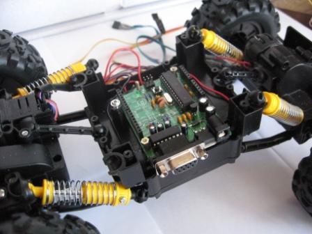 Еще один плюс в пользу этого проекта – это использование в качестве микропроцессора платформы Arduino. Если кратко – это микропроцессор, конкретно - Atmega 168, заключенный в очень удобную физическую и программную оболочки. Т.е., его и программировать и подключаться к нему одинаково легко. Если бы использовался отдельно микроконтроллер, то гемора было бы много больше, только одно программирование и прошивка стоят хорошего головняка. У меня, по подобию Джо использована платформа Freeduino, версия MaxSerial – те же яйца, только с боку, разницы с Arduino нет. Физическая оболочка представляет собой плату, на которой установлен микропроцессор, кварц, COM-порт (опять микросхема Max, но Max232), штырьки ввода-вывода и стабилизатор питания на 5в – l7805. Freeduino обошелся мне с пересылкой 1120 руб, сам модуль стоит 800 руб. В своем городе я найти эту платформу (любой xxxDUINO) не смог, поэтому пришлось заказывать. Пути удешевления – собрать самому, проект открытый, и обойдется, наверное, рублей в 400. Или использовать «голый» микропроцессор. Заказывал в . В присланной коробочке находился сам Freeduino, мини CD со всем необходимым и даже более (типа схем) и, что важно - «папа» - коннектор питания. Важно это потому, что этих коннекторов при внешней схожести – огромное количество, не понятно зачем такое разнообразии. Разница между ними в толщине центрального штыря. Поэтому подбор правильного коннектора меня бы немало озадачил, тем более, что так и произошло с роутером. Итак, микропроцессор нам нужен для того, чтобы отрабатывать команды, приходящие с компьютера (через сеть WiFi на роутер, с роутера через прогу ser2net) на COM-порт микропроцессора. Отработка команд представляет собой их получение, и отправка сигналов на выводы Freeduino, к которым подключены либо провода на существующую цепь в машинке (как в проекте Джо) или свой драйвер двигателей. С подключением к существующей сети вроде как все просто, а ниже рассмотрим самодельный драйвер двигателей и подключение к нему. Выводы и сигналы используются цифровые, это значит, что сигнал «включить» - это «1», на вывод идет +5в, сигнал «выключить» - «0», на вывод идет 0 в. Осталось уточнить два момента. Первый – хак Джо, приведенный в его проекте, а именно подключение к 4му пину COM-порта Freeduino 9V через резистор 1Ком. Я это сделал так – с кабеля для COM-портов, с части для Freeduino, вывел с 4го пина проводок с коннектором PBS. Этот коннектор я одеваю на штырек PLS, находящийся у меня на плате драйвера моторов, штырек соединен через резистор с одним из контактов в колодке штырьков, которая одевается у меня аккурат в разъемы вводов-выводов на плате Freeduino. И этот контакт попадает в контакт 9V (если вы подаете питание на плату 9v) на плате Freeduino. В разделе про драйвер двигателей это хорошо видно на фото. Нужно все это для того, чтобы Freeduino не перезагружался, т.к. низкий сигнал на этом пине – команда Freeduino к перезагрузке. Фото пуллапа 4го пина COM порта
