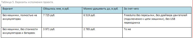 Итоговая стоимость данного проекта 7 596 руб. или 253 доллара. Можно сократить до 4-5 тыс.руб., если на компе есть COM-порт и вместо аккумуляторов использовать батарейки. Если делать полностью на аккумуляторах, то стоимость уже составит 9 325 руб., однако не стоит забывать, что 40% этой суммы – стоимость аккумуляторов. При этом, видимо придется посадить силовую цепь на стабилизатор питания типа 7805, чтобы не дать моторам просадить напряжение на аккумуляторах ниже 0,9 вольт на 1 аккумулятор под нагрузкой. Для наглядности и прикидки к своему проекту приведу еще одну таблицу: Таблица 5. Варианты исполнения проекта.